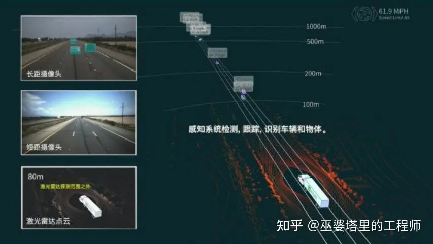 圖森采用了專門的攝像頭,以及特殊的軟件算法,可以使白天環(huán)境下感知距離達(dá)到1000米。在這個距離范圍內(nèi),圖森的感知系統(tǒng)可以能夠檢測前方車輛的類別,橫向位置(屬于哪條車道)和縱向位置(距離以及距離的變化情況)。