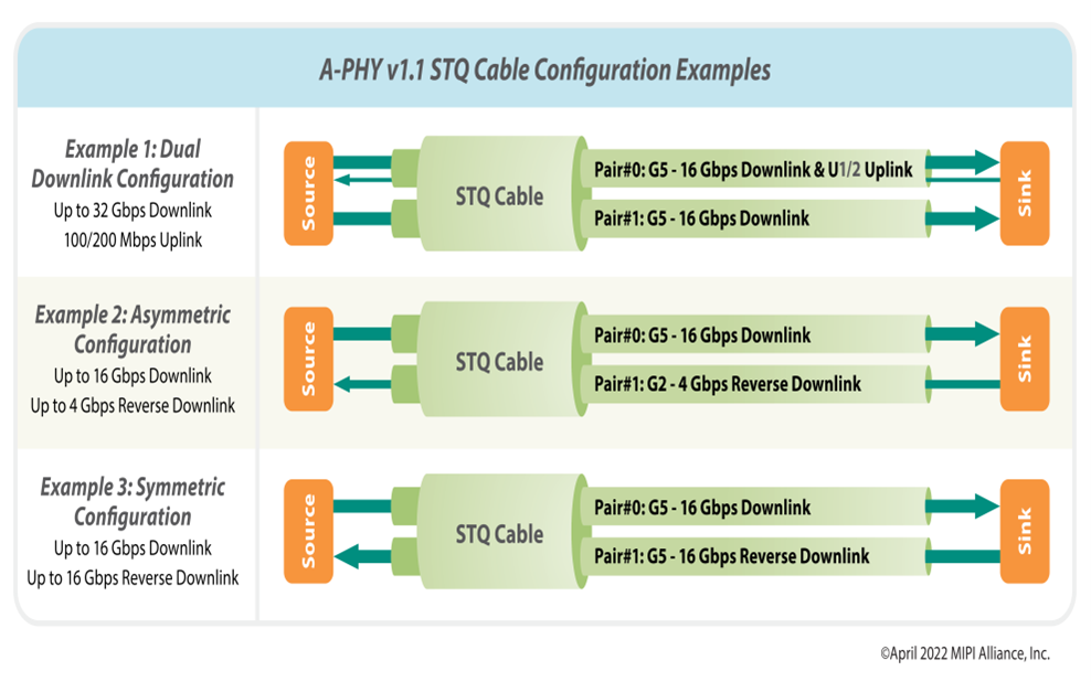 圖2:A-PHY v1.1增加了A-PHY的靈活性,支持Star Quad (STQ)電纜的使用。通過三個新的配置選項(xiàng),OEM可以利用更多方式滿足連接需求。